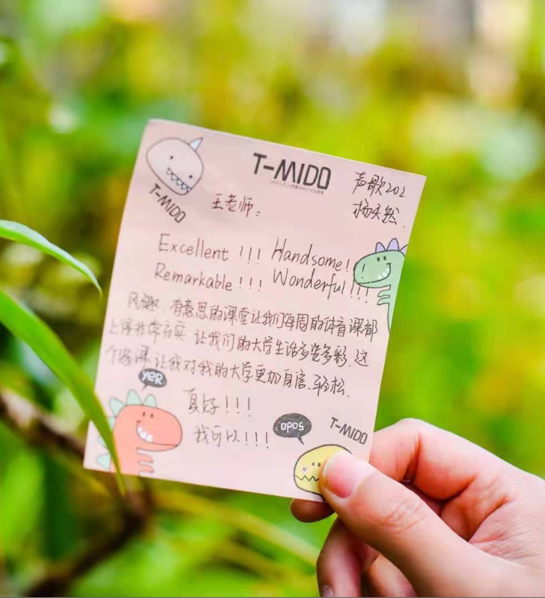 “我上课喜欢轻松活泼的氛围,不是一板一眼的,学生应该有更多的自主性。”个性温和的王子豪从来没有在课堂上发过脾气,他理解不同学生的基本情况,从求学和人生规划的角度,推心置腹地阐明体育课的重要性;他会赞扬表现优异的同学,也会通过善意幽默的方式提醒动作错误的同学;他帮助拘谨羞涩的同学正确理解体育舞蹈,鼓励他们敢于表现,也会让活跃张扬的同学带头做示范,赞扬他们的动作和表现力,正向引导他们帮助其他同学。许多学生毕业后,在每年教师节还会给王子豪发送问候祝福,一位钢琴系2015级的学生说:“我现在在匈牙利的塞格德大学,非常想念您的课。我自认为四肢不协调,您却从来没有批评或是嫌弃我学得慢。是您整整一学期的耐心指导和不断鼓励使我树立了信心,现在在国外,偶尔参加舞会时也能跳上一小段。”