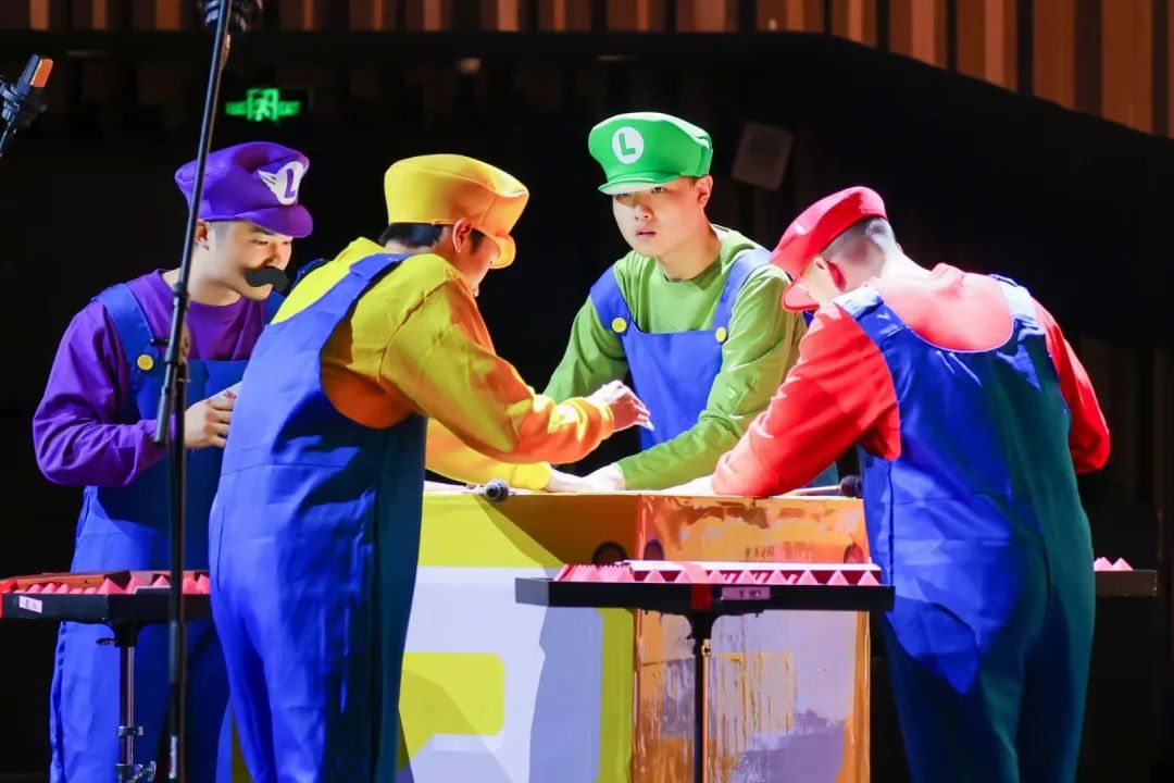 音乐会开场曲目为瞿小松作曲的《定风波》,灵感来源于苏轼的同名词作,结合了包括传统中国打击乐器、西方现代打击乐器在内的多种打击乐器,通过丰富的音色和节奏变化,创造出多层次的听觉体验,展现了丰富的表现形式和艺术内涵。随后上演的《Sand Box》充满互动性、趣味性,四位演奏者扮作超级马里奥,以灵动的表演和精彩的演奏调动起现场的热烈气氛。
