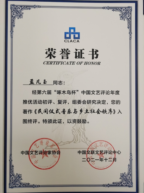 近日,学院图书馆馆长、音乐学系教授孟凡玉的著作《民间仪式音乐与乡土社会秩序》,在第六届“啄木鸟杯”中国文艺评论年度推优活动中入围终评。