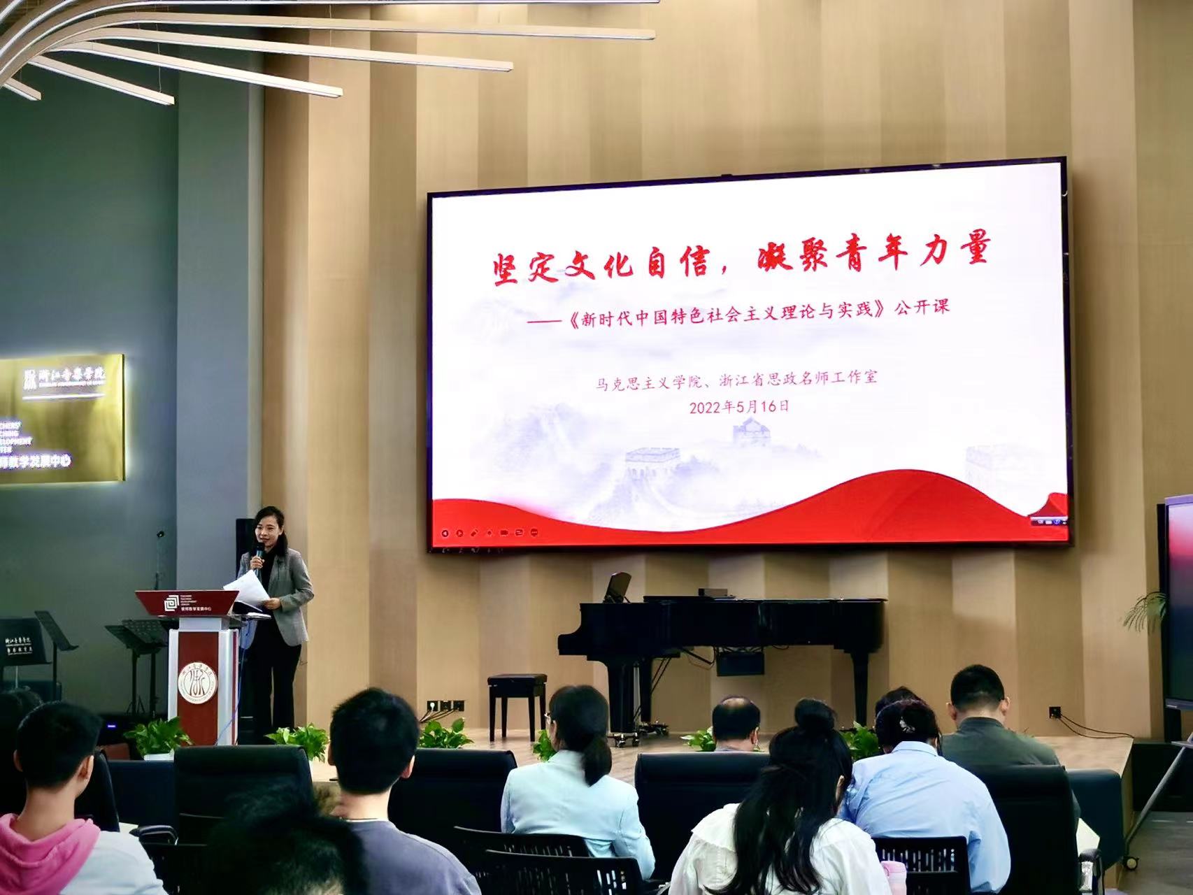 “横断山,路难行。天如火来水似银。亲人送水来解渴,军民鱼水一家人。”“都市的街巷已灯影婆娑,社区暖暖流淌的欢乐,远山的村落火苗闪烁,渐渐明亮小康的思索”……公开课上,在教师的布置引领下,学生们用歌声忆往昔峥嵘岁月,用旋律奏响时代精神。随后,课程负责人丁俊华同学院教师汪昌博、吴涤就文化自信开展导学和交流。丁俊华阐述了文化的意义,并表示,青年是推动历史发展和社会进步的重要力量,更是坚定文化自信的关键主体。在新的历史方位下,青年更应当坚定文化自信和文化自觉,为时代抒怀,为人民而歌。汪昌博就“青年为何要坚定文化自信”作了《从柏林到杭州,因文化而自信》的主题交流,以“认同”这一关键词贯穿讲述了他的艺术之路、成长之路、文化自信自觉之路;吴涤就“如何传承和发展中国文化”作了题为《新时代文艺作品创作中文化自信的融合体现与创新实践》的主题交流,以《彩带献北京》《青瓷》《使命》作品为例,阐释了如何传承并发展中国文化。