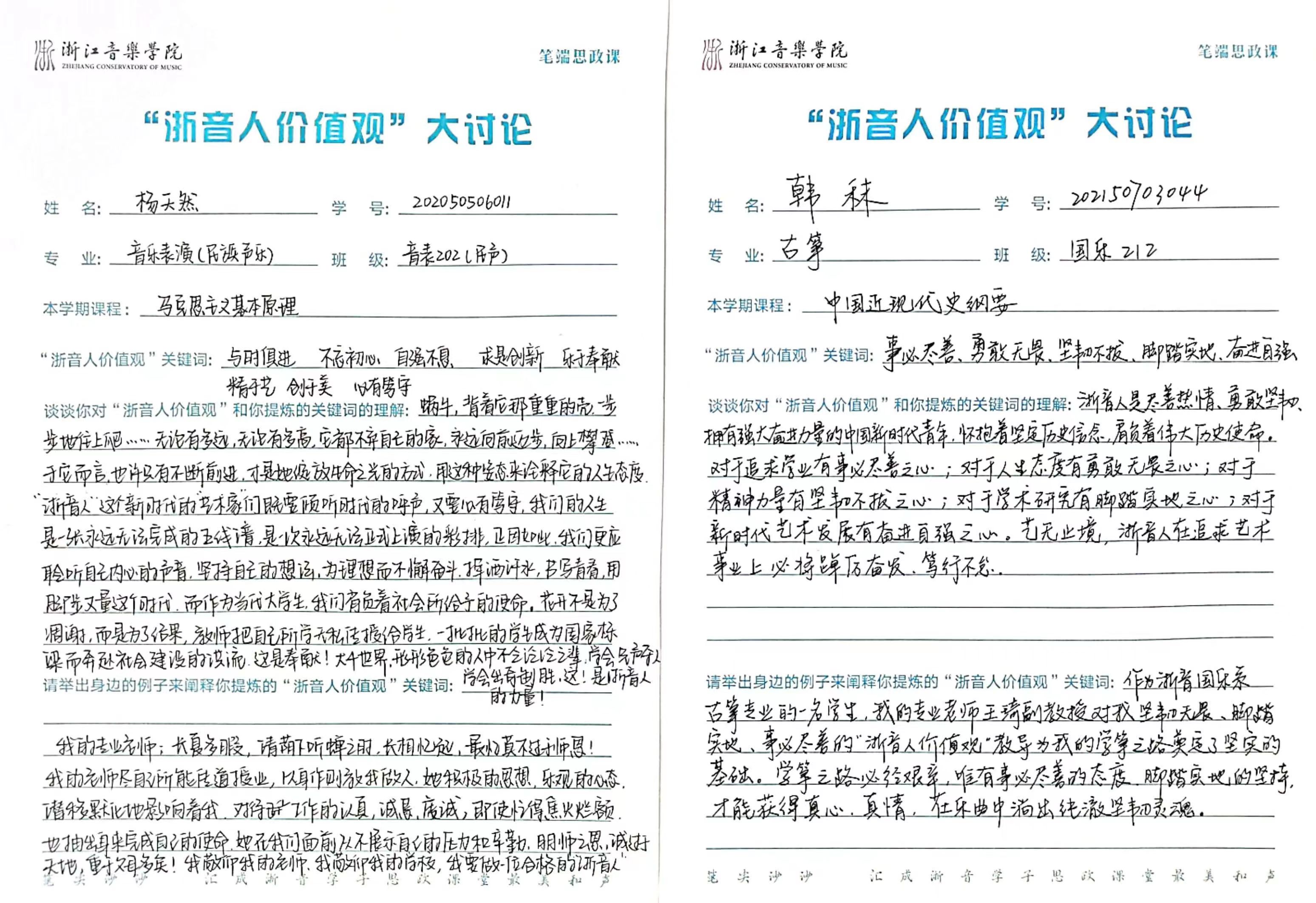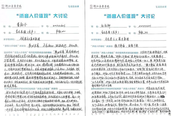 按照学院动员发动和集中研讨的阶段性要求,全体思政课教师认真学习习近平总书记关于教育重要论述,深刻领会总书记对文化文艺工作的重要指示精神等,充分了解“浙音人价值观”大讨论的意义,以结合教材、融入课堂的方式,引导学生开展广泛深入讨论,并创新性地以“笔端思政课”为载体,让学生将对“浙音人价值观”的感悟和感受运于笔端。在讨论中,“事必尽善”“德艺双馨”“不忘初心”“尽善尽美”“立于德、精于艺、创于美”等是高频词汇,充分展示了浙音学子的精神面貌。目前,“浙音人价值观”大讨论在思政课教学中实现了全员参与、全员讨论,累计1300多名学生参与。