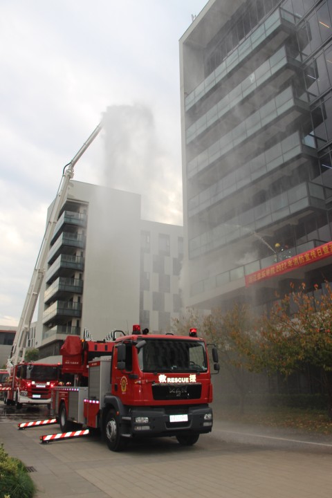 本次演练分为人员逃生疏散、油盆火灾扑救两个阶段。随着现场总指挥宣布演习正式开始,消防警报响起,校卫队3名应急队员接到校园110指挥中心救援指令后,身着救援服,携带水带、灭火器等器械迅速赶到着火点,指挥引导楼内学生有序疏散,并打开室内消火栓进行火灾扑救。战勤保障大队云梯车也第一时间抵达公寓楼下,随着云梯的升起,四楼阳台内的被困学生被顺利解救,水罐车、高喷车也配合展开了高空灭火作业。疏散演练结束后,消防教官进行了点评,对消防灭火器操作相关知识作了讲解和示范,随后模拟初期火情,引导师生使用灭火器进行扑灭实操演练。