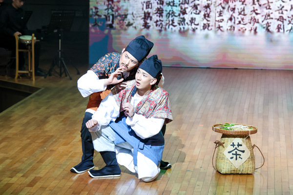 《茶酒论》是《中国戏曲志·甘肃卷》中收录的敦煌文献遗存,根据抄录流传下来最完整的版本来看,其创作于晚唐时期,出自晚唐乡贡进士王敷之笔。原文献内容通过拟人化的“茶”与“酒”的论争,反映了不同阶层人群的生活态度,最后通过“水”的调解,制止了两者的争论,并告诉他们,没有水,他们都不能成其所以然,所谓万物和谐共生,从而化解了双方的矛盾,表达了作者追求“以和为贵”的政治理念。原文本的内容结构、人物关系和故事情节相对完备,给后人留下了广阔的创作空间。本剧便是在原文献《茶酒论》的基础之上研习创作,剧本从文献的写成背后、流传背后、现代呈现三点一脉的视角切入,并展开想象,在探索敦煌文献《茶酒论》前世今生的同时,挖掘展现其背后的故事。全剧分为两幕(上下两阙),第一幕主以现代读献者与晚唐作者王敷、北宋抄录者小和尚的对话,来展现王敷创作《茶酒论》的情怀背景与抄录保护敦煌古文献的流传历程,为引出正戏《茶酒论》作为铺垫。第二幕主要对是原文献《茶酒论》的创作解读与舞台重现。在创演的过程中,演员的表演状态、形体动作、音乐风格等都力求靠近唐代歌舞戏的朴拙感,在表达原文献核心思想的同时,将唐代“戏弄”表演风格展现在观众面前,实现文献内容与舞台形象、核心思想与人物情感的有机融合,发挥它本身的艺术价值与文化价值之外,也展现它超越时代的社会价值。