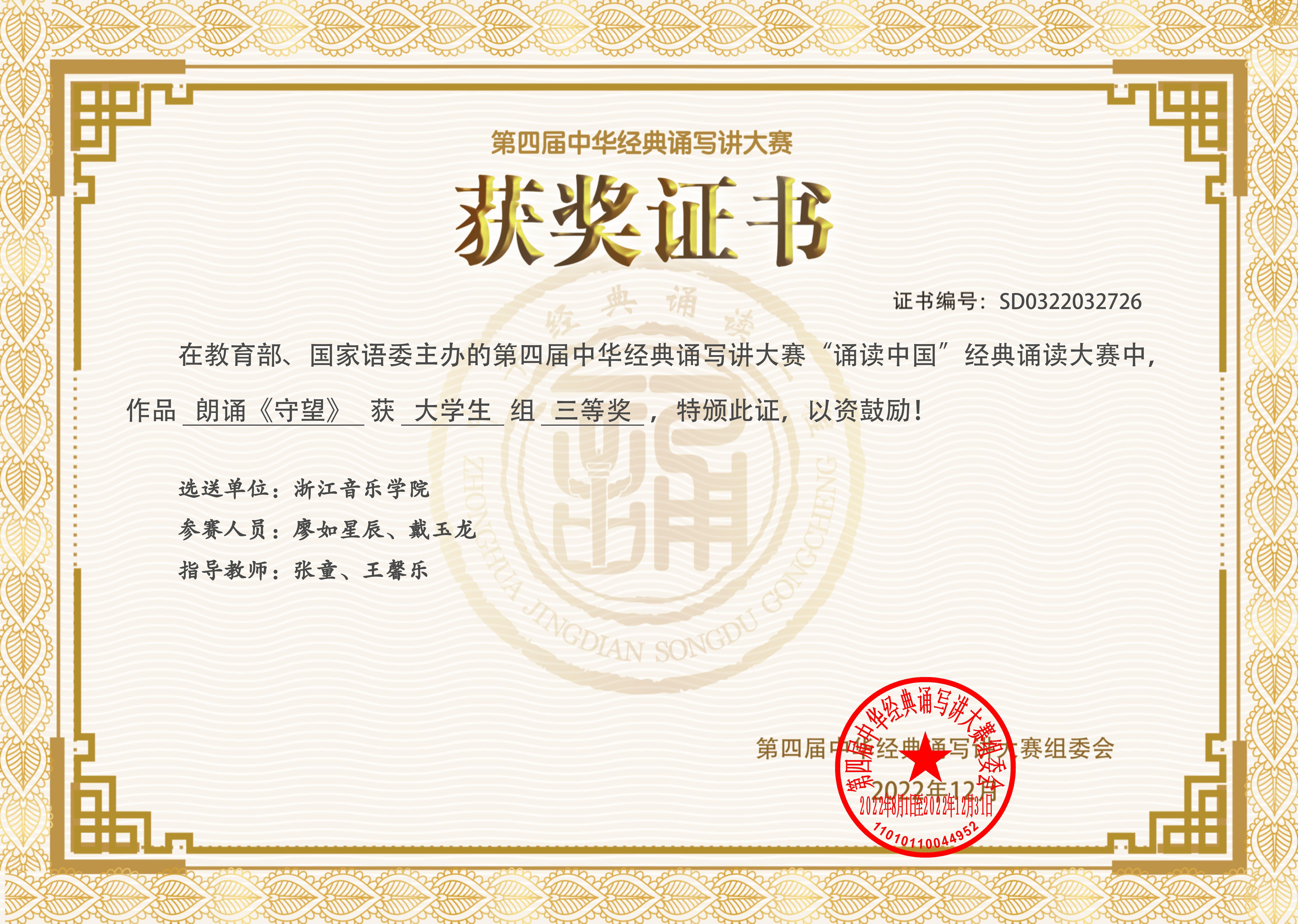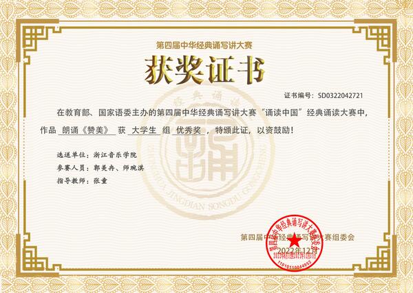 近日,由教育部、国家语委主办的第四届中华经典诵写讲大赛“诵读中国”经典诵读大赛全国总决赛落下帷幕,学院学生在文艺教研室主任张童和戏剧系教师王馨乐的指导下斩获佳绩。其中,戏剧系廖如星辰、戴玉龙的朗诵作品《守望》获得三等奖,郭美冉、师琬淇的朗诵作品《赞美》获得优秀奖。
