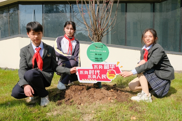 迎着午后温暖的阳光,同学们热情高涨,有模有样地当起了“园艺工程师”,与老师们分工合作,挥锹铲土、扶树正苗、提水浇灌……热闹的场面温馨而快乐。一眨眼的功夫,一株株红梅便“亭亭玉立”在沃土之上,芳菲烂漫,明艳动人。栽种完毕后,来自初中段的7个同学分别代表各自班级认领了一棵小树苗,并在认养牌上写下了寄语,伴着美好希望一同挂在了稚嫩的树苗之上。