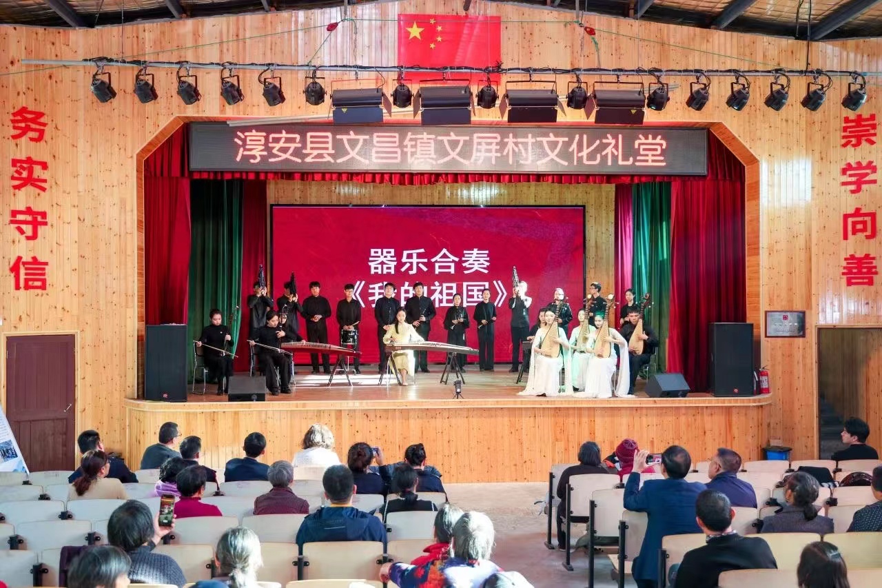 来到淳安县的第一站,国乐系师生们就深入文昌镇中心小学,与当地的小学生们开展交流,了解孩子们对艺术的认识和需求。在与孩子们的交流中,研究生们分享了自己对传统音乐的热爱与认识,通过展示乐器、讲述音乐故事,激发了小学生对国乐艺术的好奇心和兴趣。通过在文屏村建立起“党员文化志愿服务团队”,国乐系师生用实际行动支持乡村美育教育,用音乐浸润中小学生,在学生中播撒一粒粒艺术的种子,搭建起传承发展中华优秀传统文化的桥梁。