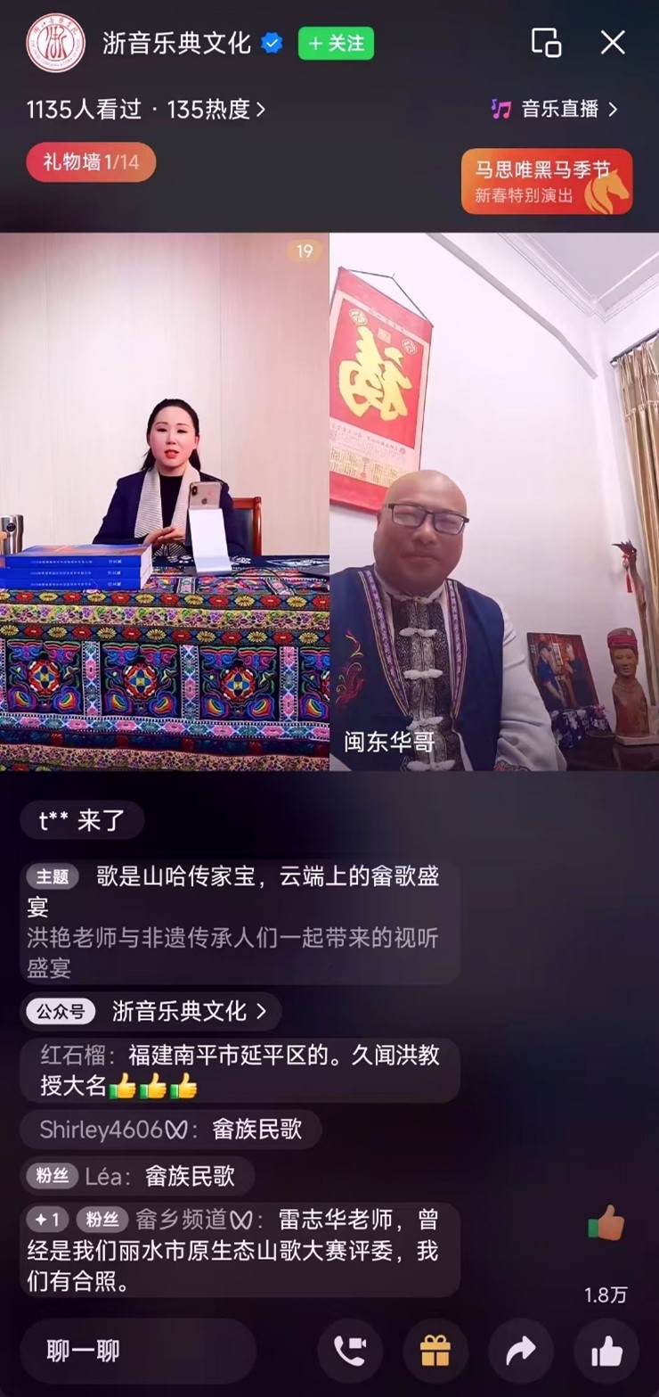 1月23日,“云端上的畲歌盛宴,歌是山哈传家宝”公益直播活动成功举办。直播通过“一根网线”连接起畲族音乐代表性传承人、研究者、爱好者及广大观众,共同在线上探讨文化传承与发展,不仅有效融合了高校资源与地方非遗文化,还充分彰显了畲族音乐的艺术价值,为非物质文化遗产的保护与创新发展注入了新的活力。本次活动由乐典文化主办,音乐学系教授、畲族音乐文化研究中心主任洪艳担任主播。