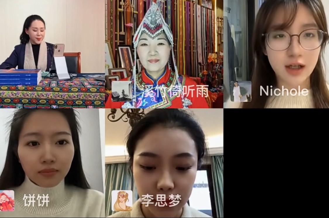 紧接着,宁德市三月三歌会代表性传承人钟神滔连线进入,他通过讲解和演唱畲族民歌《有缘久久长》让观众领略到洪艳所说畲歌“折声”的独特韵味。随后,贵州省畲族凤凰装传承人赵通秀和浙江泰顺县畲族彩带传承人雷秀娇让大家的体验不限于听觉,线上转场他们各自位于贵州和浙江泰顺的工作室,向观众呈现畲族服饰与彩带的工艺,生动诠释了畲族文化的多元魅力。与此同时,声乐歌剧系学生徐冬彬、李思梦和音乐学系学生肖子妍也参与了连线,演唱了徐冬彬采集自传承人雷秀娇、并由洪艳改编的泰顺畲族童谣《放牛歌》,并各自分享了学习畲歌的历程和感悟。来自龙泉市的畲歌传承人蓝月林与雷荣花则以男女对唱的形式,演绎了龙泉调畲歌《傍歌》,他们如泉水般的润泽、如仙鸟般嘹亮的嗓音交叠出大自然的和美声音。丽水市莲都区畲族叙事歌传承人蓝新华在与洪艳的对话中,侧重介绍了畲歌编创的口诀和语调平仄,以及畲歌对歌“八大法”。之后,90后畲族古物收藏家蓝文鑫通镜头带领大家参观了他的畲族服饰工作室,随后他用各地畲歌调演唱了他自编的歌曲《石榴花开满山香》。在活动尾声,景宁县畲族民歌传承人钟献梅与目前景宁最年轻的畲歌传承人雷叶勇军演绎了景宁调的《情歌对唱》和《歌是山哈传家宝》,这些传承人们通过自己的歌喉让我们听到了畲族文化代际传承中的不朽音符。