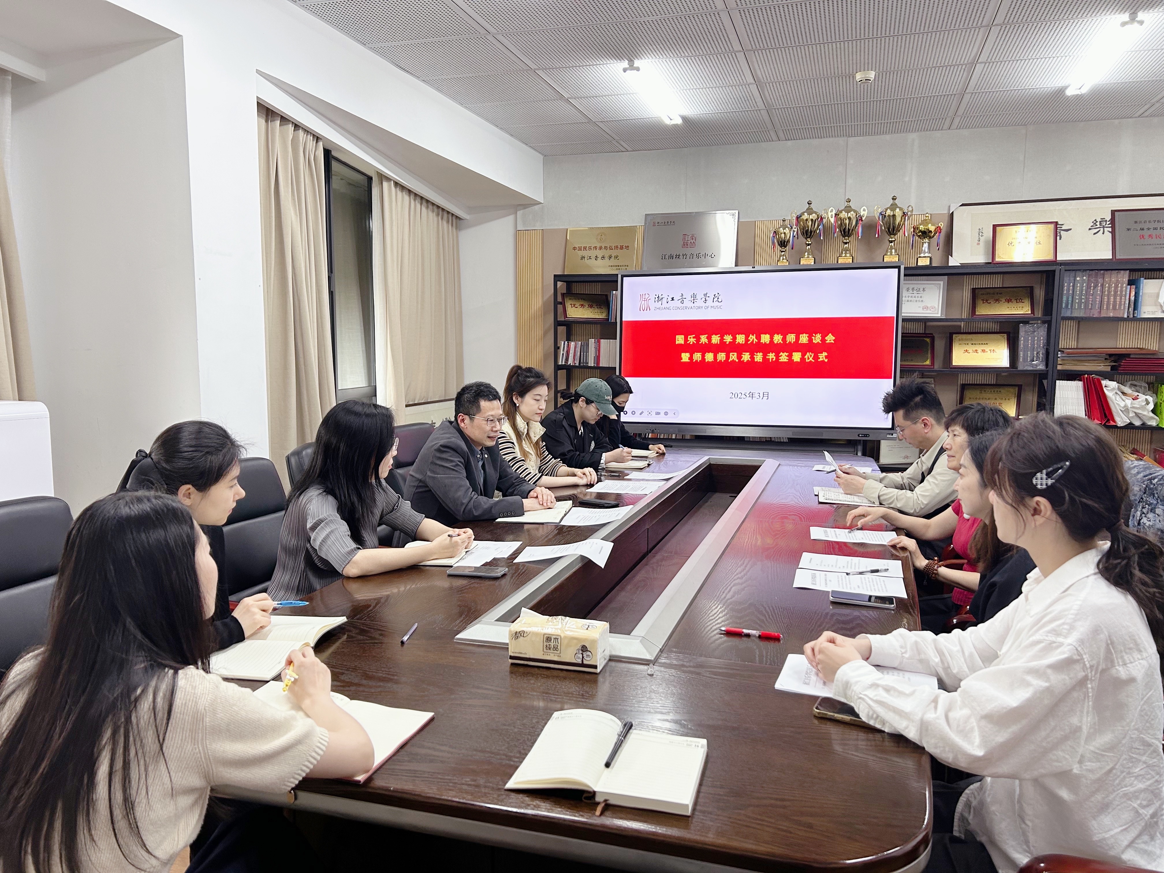 为深入贯彻中央八项规定精神学习教育,推进开门教育以学促干,3月27日下午,国乐系召开新学期外聘教师座谈会暨师德师风承诺书签署仪式。系党总支书记、副主任李旭芳,系副主任张咏音及系教研室主任、系外聘教师参加会议。