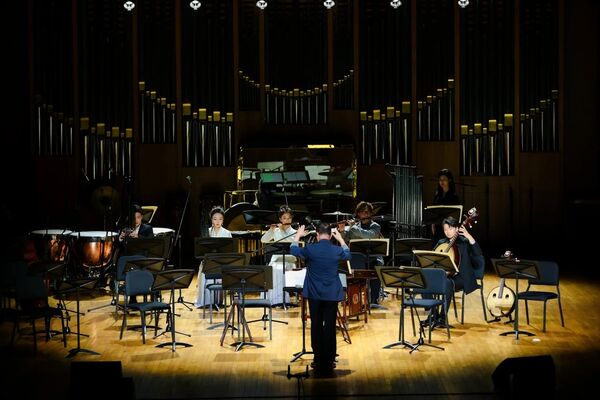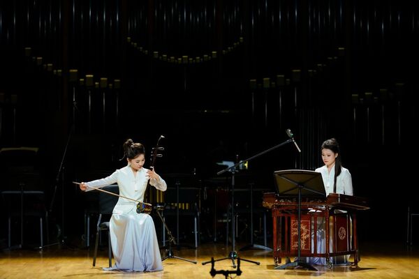 随后,由乐团青年二胡演奏家裴文钰与国乐系学生尤煊颍演绎了谭盾的二重奏作品《双阙》。作曲家将古朴的乐思与现代作曲技法相结合,使得乐曲在弓弦与琴竹的互动中展现出新的活力,凸显了其对传统演奏模式的突破性思考。