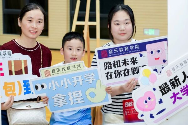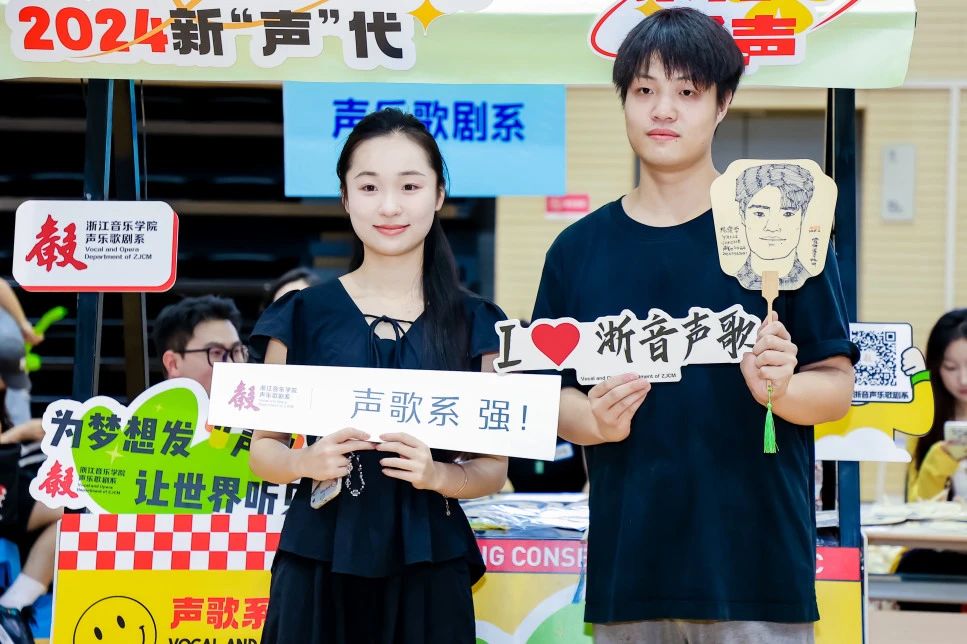 各院系用心策划、创意十足,戏剧系为每位新生定制专属“车票”钥匙扣,始发站是自己的高中,终点站是浙音,每张“车票”上都有自己的名字,带给新生满满归属感。声乐歌剧系辅导员发挥自身专业特长,细心观察每位新生的照片,提前半个月就开始为75位新生分别手绘漫画扇子,直到报到当天的凌晨三点才完工。每位收到扇子的学生都怀着惊喜与感动,忍不住细细端详扇子上的自己,感受来自浙音的用心与关爱。