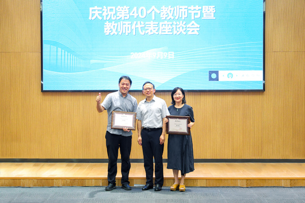 院长王瑞为今年从教满30周年的教师朱海其、钱云姗颁发荣誉证书。