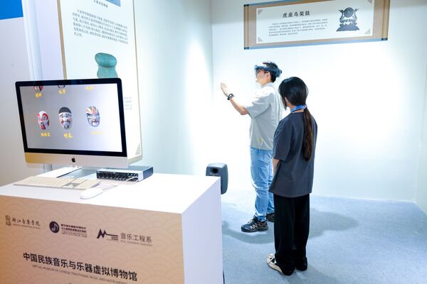 走进8号展区,可以看到互动性十足的“中国传统音乐与乐器虚拟博物馆”。博物馆借助混合现实技术,虚拟建模了戏曲脸谱和中国民族鼓,结合空间特征识别和瞄定技术,不仅可以使观众近距离、沉浸式欣赏文物,还能亲自奏响穿越时空的历史回音。