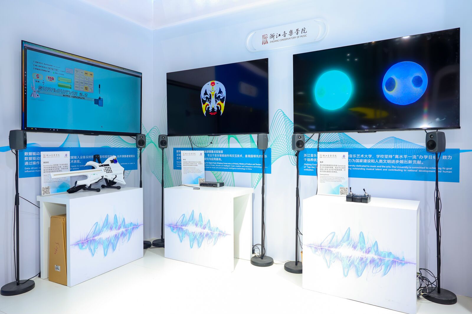 展馆中,一台无人演奏的钢琴吸引了观众的目光。输入乐谱、琴键跃动,仿佛一位隐形演奏家正在现场弹奏,曼妙音乐流淌而出,吸引了不少观众即兴演唱。这是浙音和雅马哈乐器音响中国公司共同研发的跨界钢琴智能音乐伴奏系统,能够解决音乐学习、演奏、娱乐场景中伴奏缺乏的问题。此外,浙音师生还带来符号音乐生成大模型、原创数字音乐展示、数字音乐交易平台等多件展品,具有广泛的应用场景。
