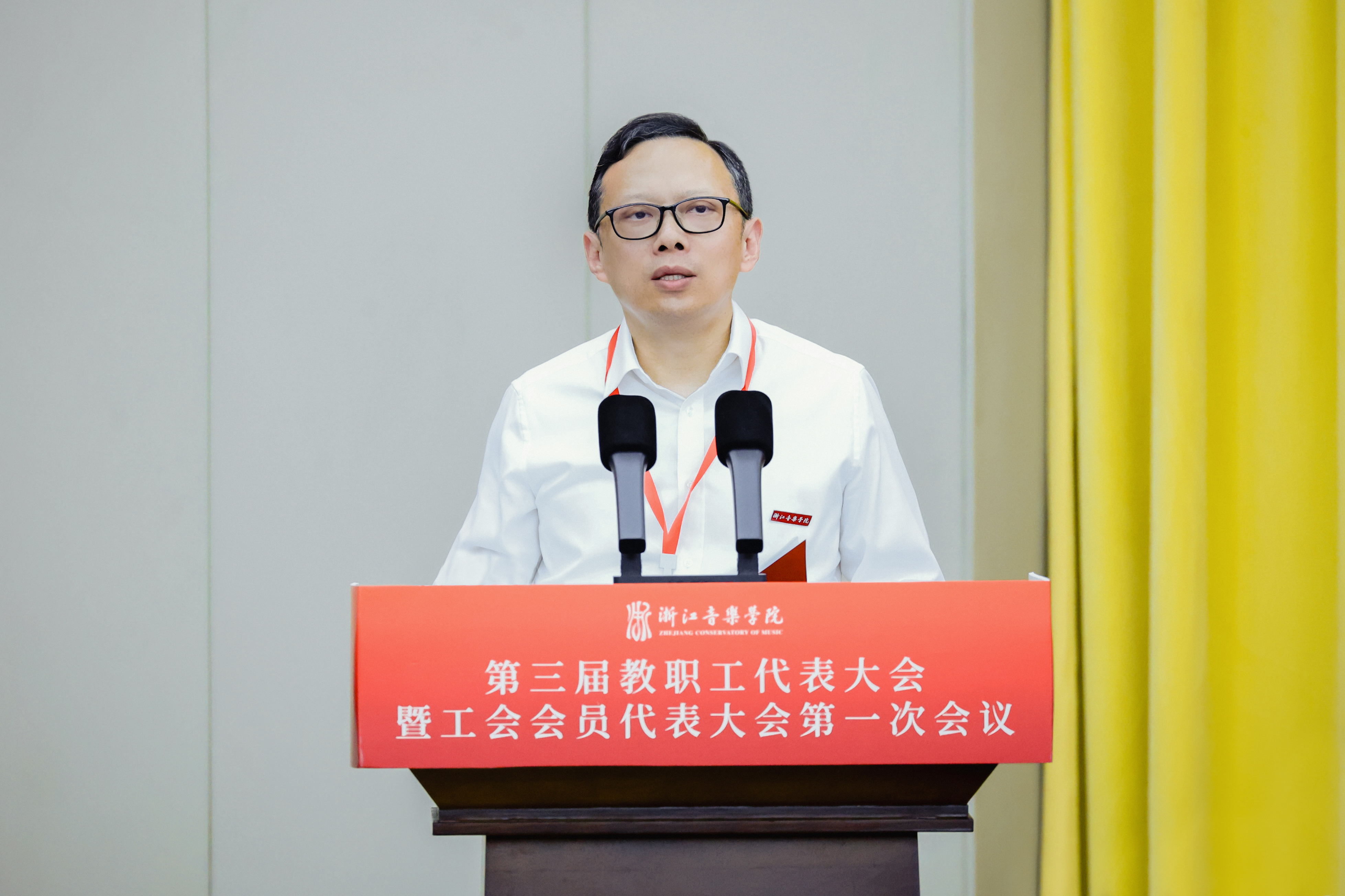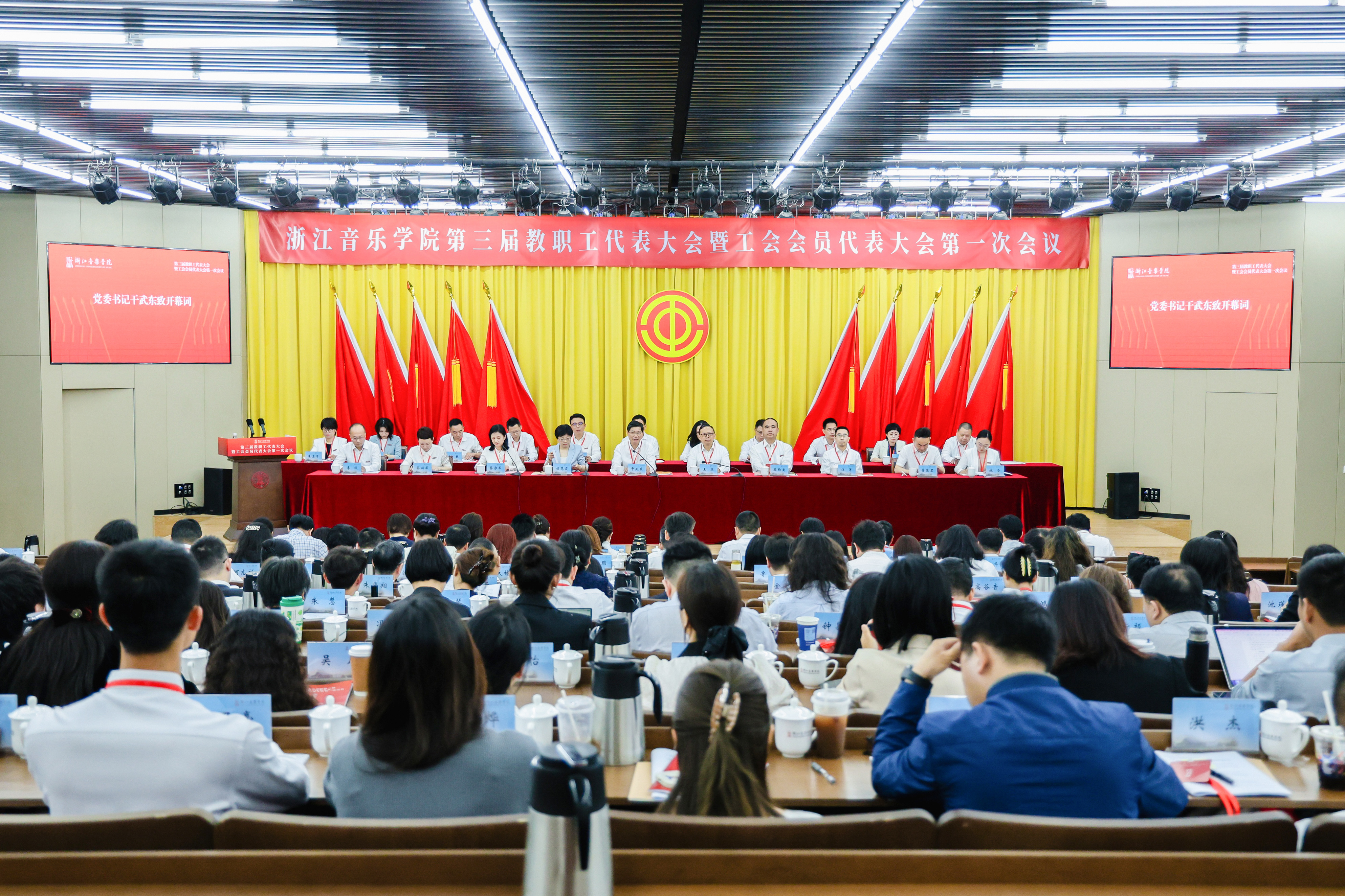 学校党委书记干武东致开幕辞和闭幕辞。院长王瑞以“锚定目标 深化改革 朝着建设高水平一流音乐学院目标奋勇前进”为题,作学校工作报告。浙江省教育工会副主席胡慧霞出席并讲话。会议由党委副书记王均寅、蔡亦军分别主持,学校党政领导班子成员参加会议。110名“双代会”正式代表、28名列席和特邀代表参加,共商学校发展大计,谱写民主治校的崭新篇章。