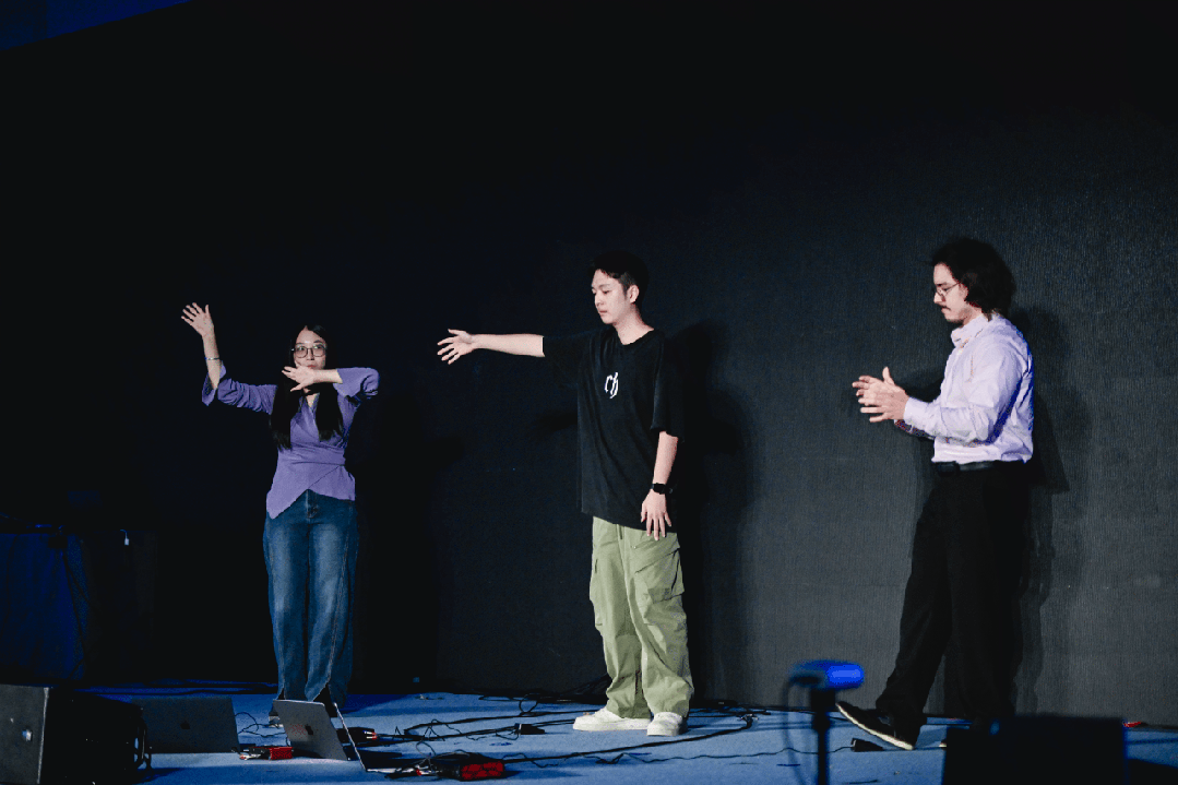 音乐会上半场以《星体》为开场,这部作品运用MediaPipe技术,将手势和姿势识别数据转化为音乐参数,创造出一种全新的表演形式;《明乐新声》将明代琵琶与实时电子音乐相结合,让古老乐器在数字时代焕发新声;《弦语千机》为古琴与一千部手机而作,通过大规模移动设备协同发声,构建出传统与现代的对话场域;《拈花化影》通过实时AI生成影像,实现了音乐与视觉的同步创造。